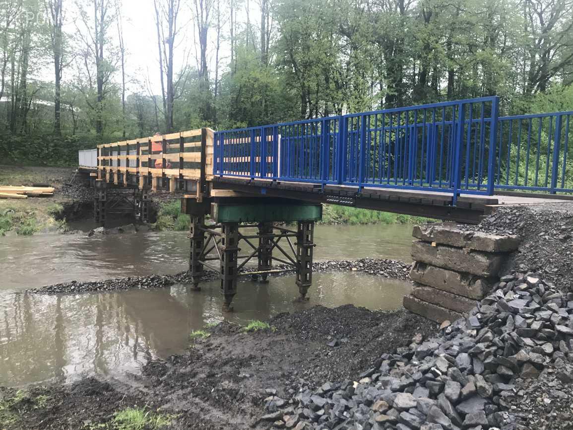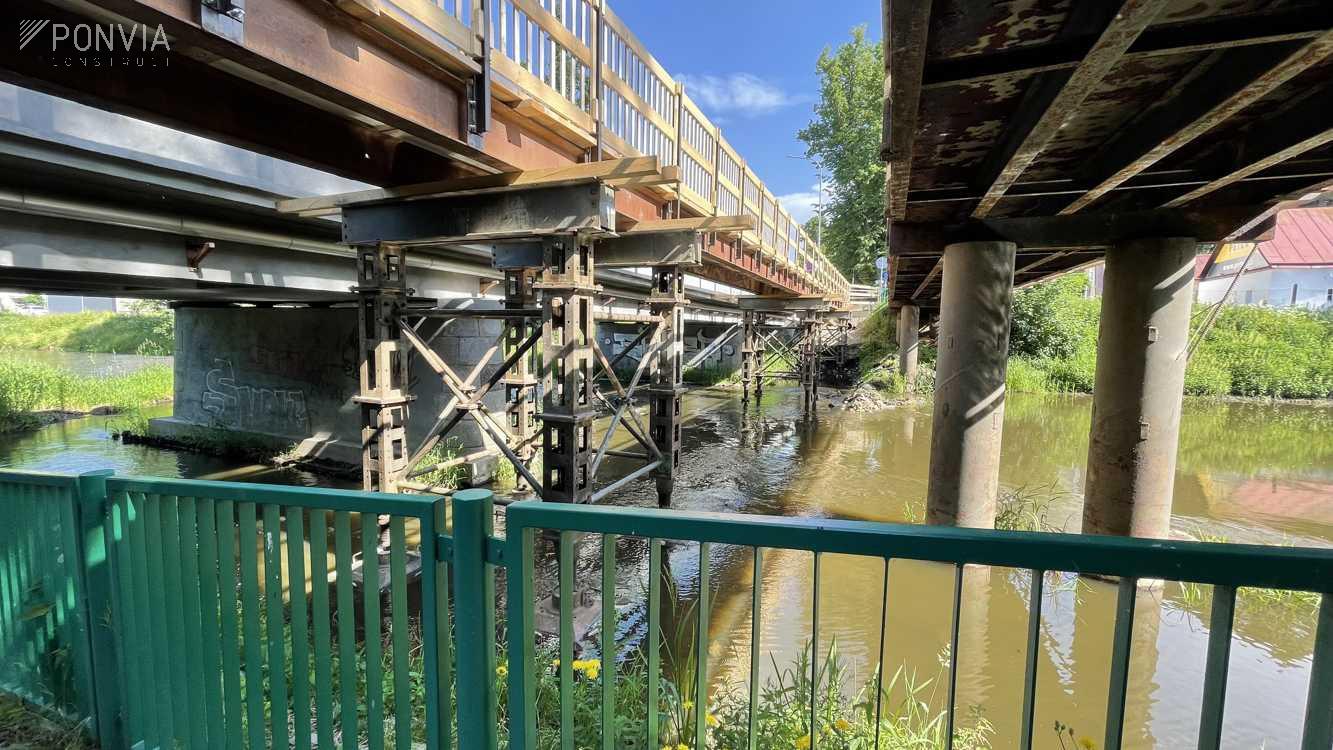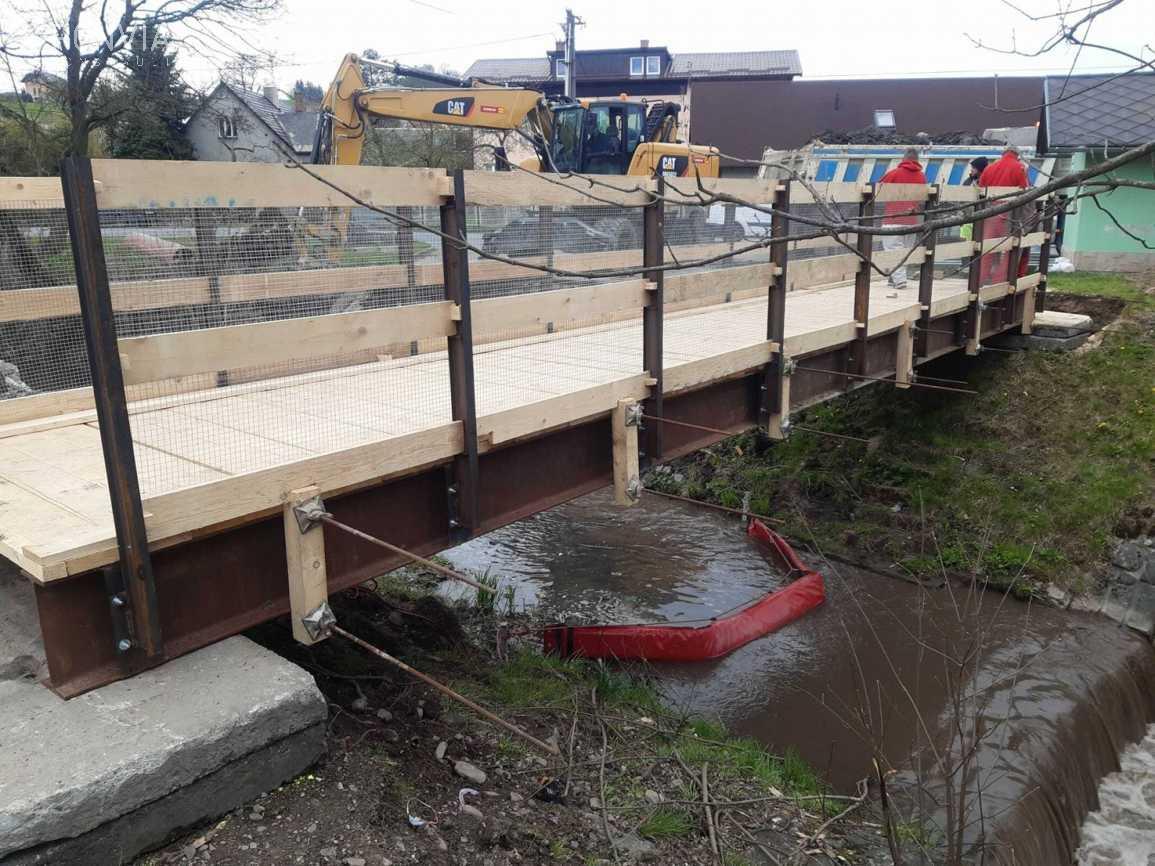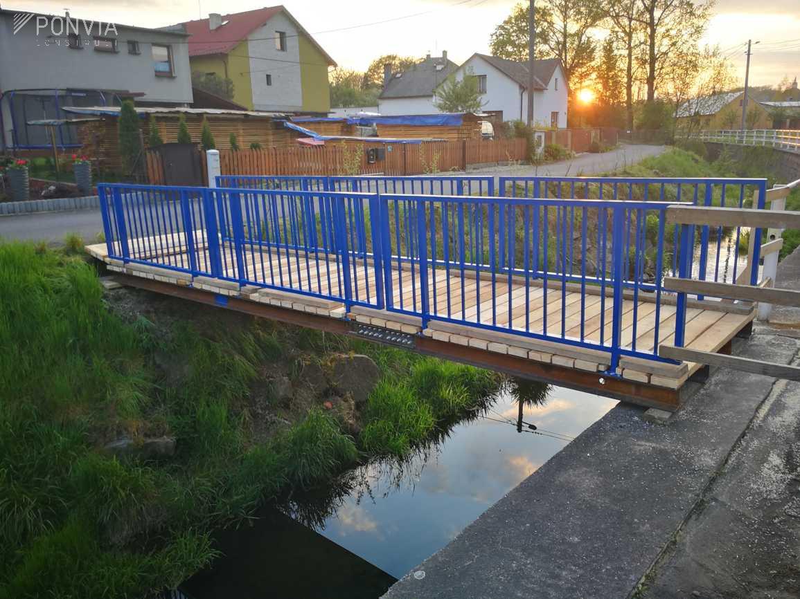 Ocelová nosná konstrukce z válcovaných nosníků HEB 160 osové vzdálenosti 0,6m modulové délky (2,5m a 5,0m). Podélně jsou modulové délky spojeny pomocí příložných profilů U120 a soustavou 20ks pevnostních šroubů M16 na celkovou délku 7,5 m. Příčné ztužení je mezi sousedními nosníky pomocí dvojice válcovaných profilů U 120 připojených 4ks šrouby M16 k hlavním nosníkům. U modulové délky 2,5m 2 mezilehlá příčná ztužení (na každém konci 1ks), u 5,0m modulu pak 3 příčná ztužení (na koncích a uprostřed rozpětí). Mostovku tvoří dřevěné mostiny tl. 50 mm, délky 2,0m a šířky 0,16m. Mostiny jsou přibity hřeby k podélným svalků 80x26mm, které jsou uloženy na příčná ztužení.